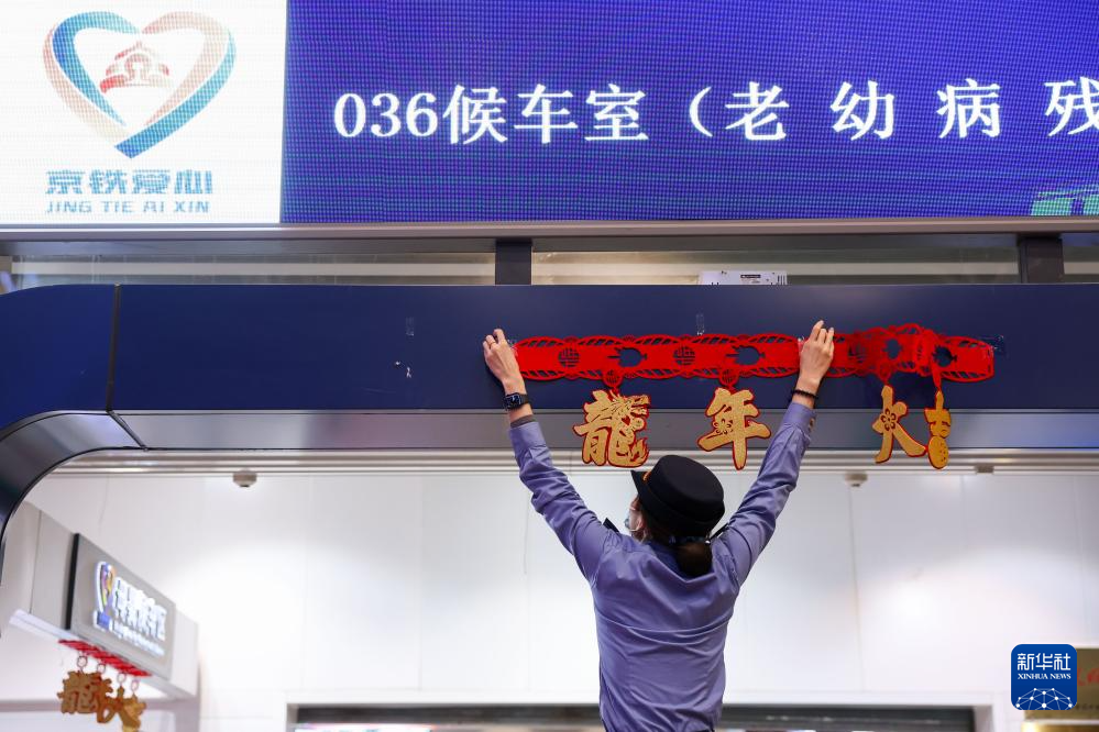 1月26日,在北京西站候车室,工作人员悬挂“龙年大吉”装饰。 当日,2024年春运启动。2024年春运从1月26日开始,至3月5日结束,为期40天。 新华社记者 鞠焕宗 摄