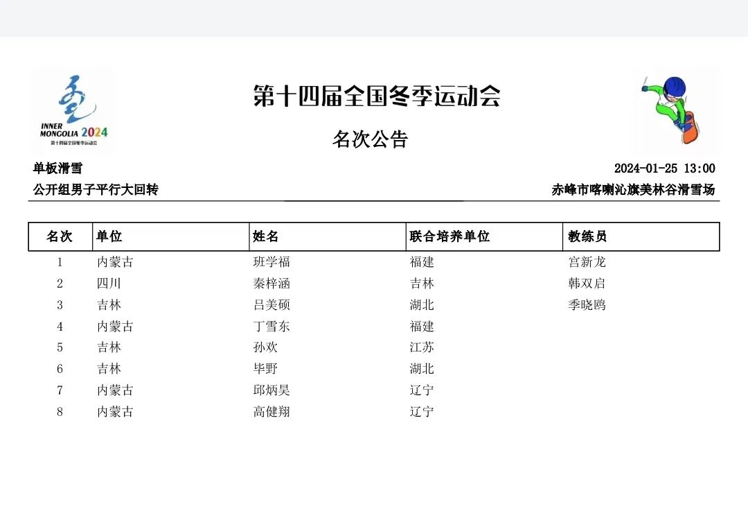 至此,本届冬运会单板滑雪比赛全部结束,共产生4枚金牌,福建省共有7名运动员参赛,其中与内蒙古联合培养运动员5名,最终共获得1金、1铜、1个第四、1个第五、1个第六的好成绩。