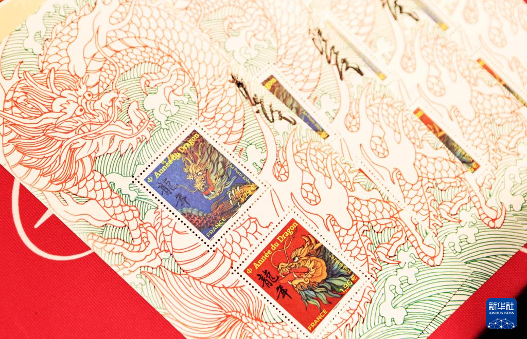 这是1月26日在法国巴黎拍摄的龙年生肖纪念邮票。