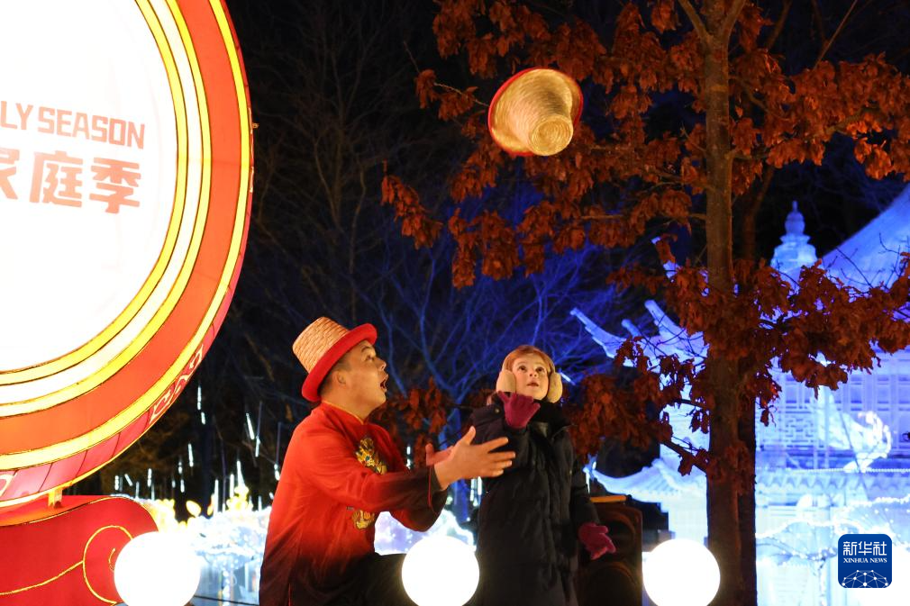 1月31日,在法国巴黎风情园展出的“山海有灵”法国豫园灯会上,中国杂技演员与法国观众互动。