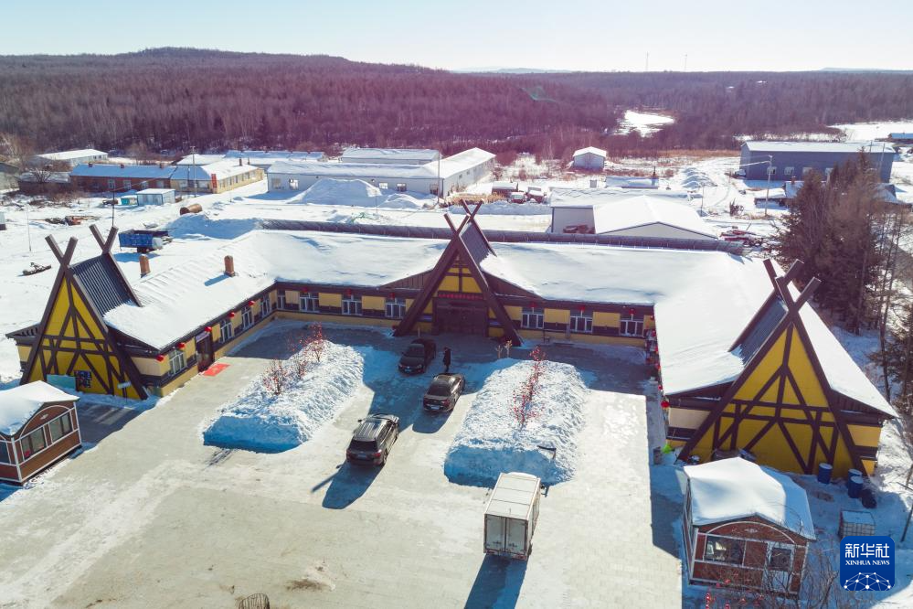这是2月2日在黑龙江省逊克县克林镇平台村拍摄的大平台雾凇景区接待中心(无人机照片)。该中心2023年开放,有效提升了平台村的接待服务水平。 新华社记者 谢剑飞 摄