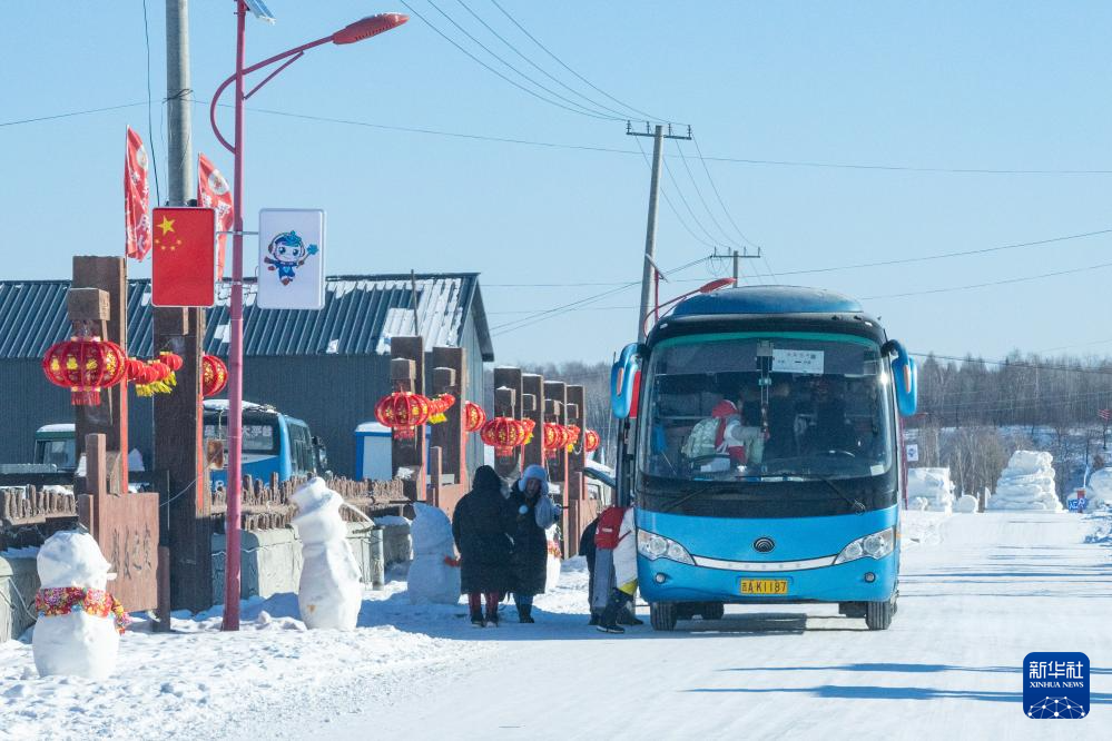 2月2日,黑龙江省逊克县克林镇平台村的游客登上旅游大巴。 新华社记者 谢剑飞 摄