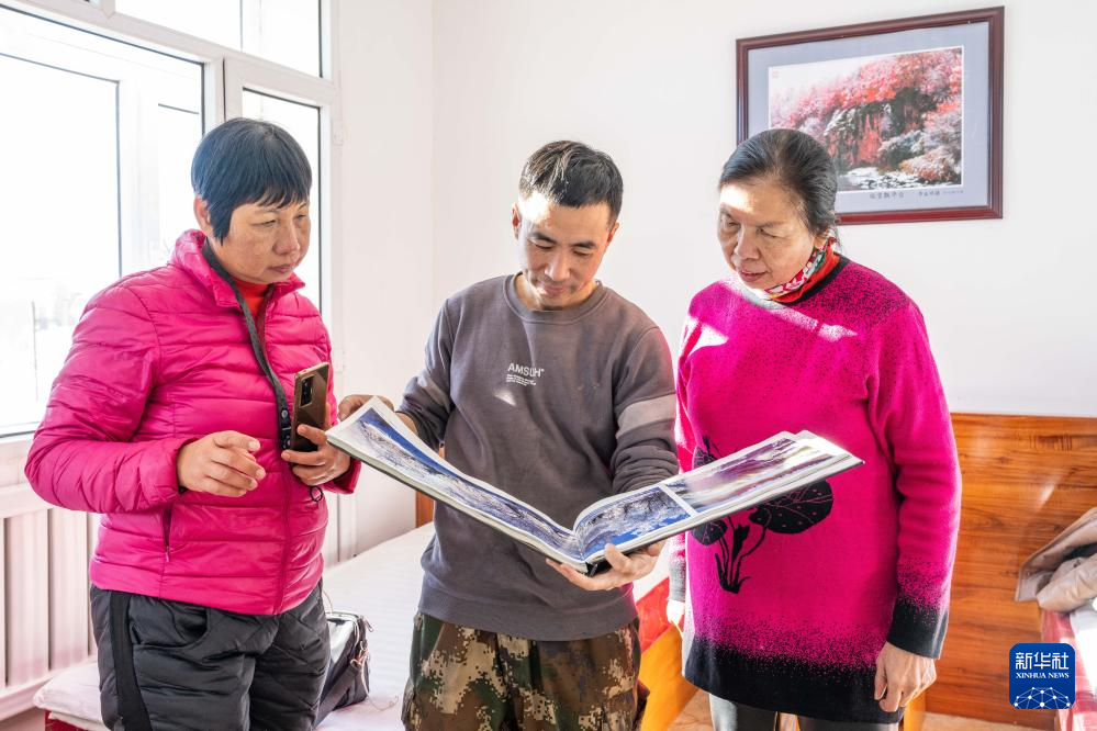 2月2日,黑龙江省逊克县克林镇平台村村民程立波(中)在自家的家庭旅馆为刚住店的游客讲解雾凇摄影点位和拍摄技巧。 新华社记者 谢剑飞 摄
