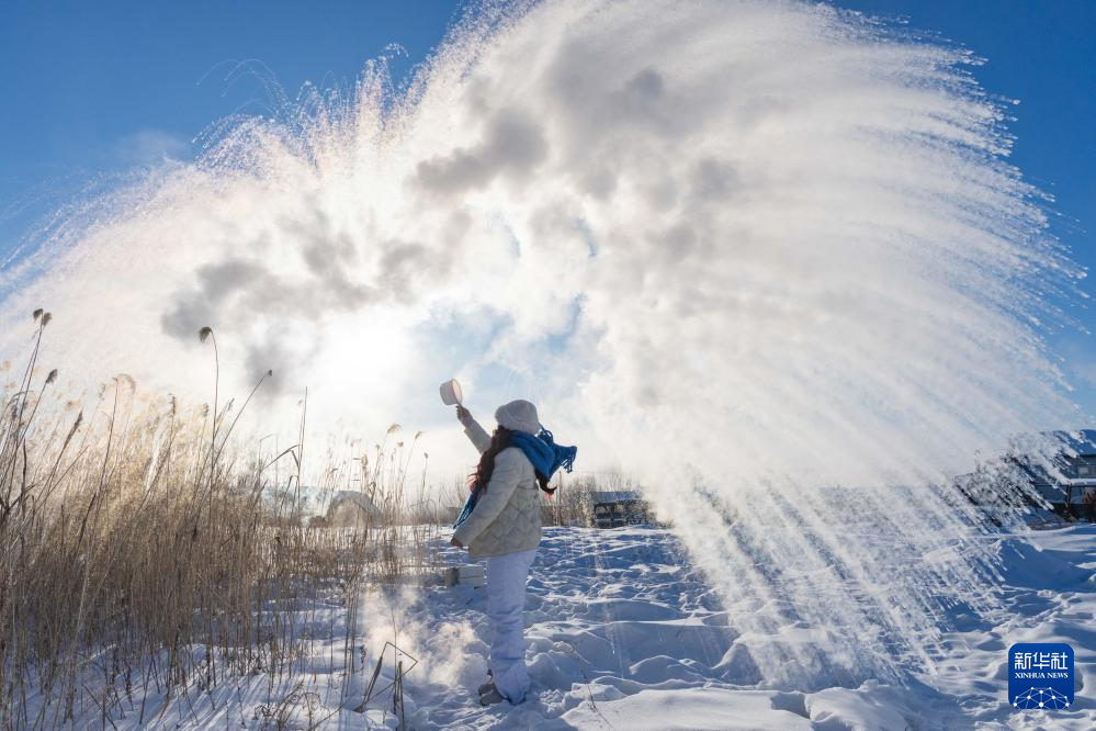 2月2日,游客在黑龙江省逊克县克林镇平台村玩“泼水成冰”。 新华社记者 谢剑飞 摄
