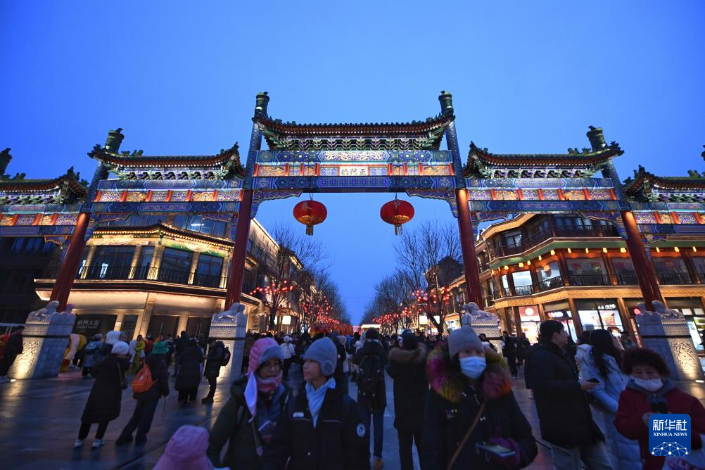 2月2日,市民游客在北京前门大街参观游览。 当日,“中轴纳福·龙跃前门”前门迎新春促消费活动开幕。据介绍,此次活动聚焦“老字号+国潮”文化,通过“春晚龙行北京”“龙腾盛世·中轴纳福”及舞龙舞狮等系列主题活动,为广大市民和消费者打造“文化+”“科技+”新体验,迎接龙年新春,让消费者在前门的古韵今风中感受京城浓浓的年味。 新华社记者 鞠焕宗 摄