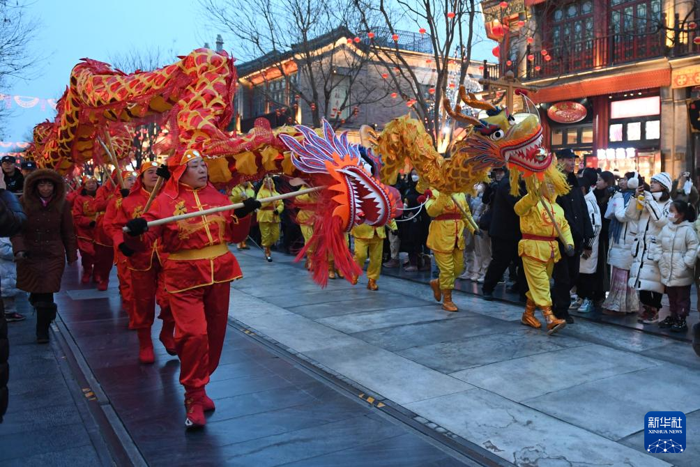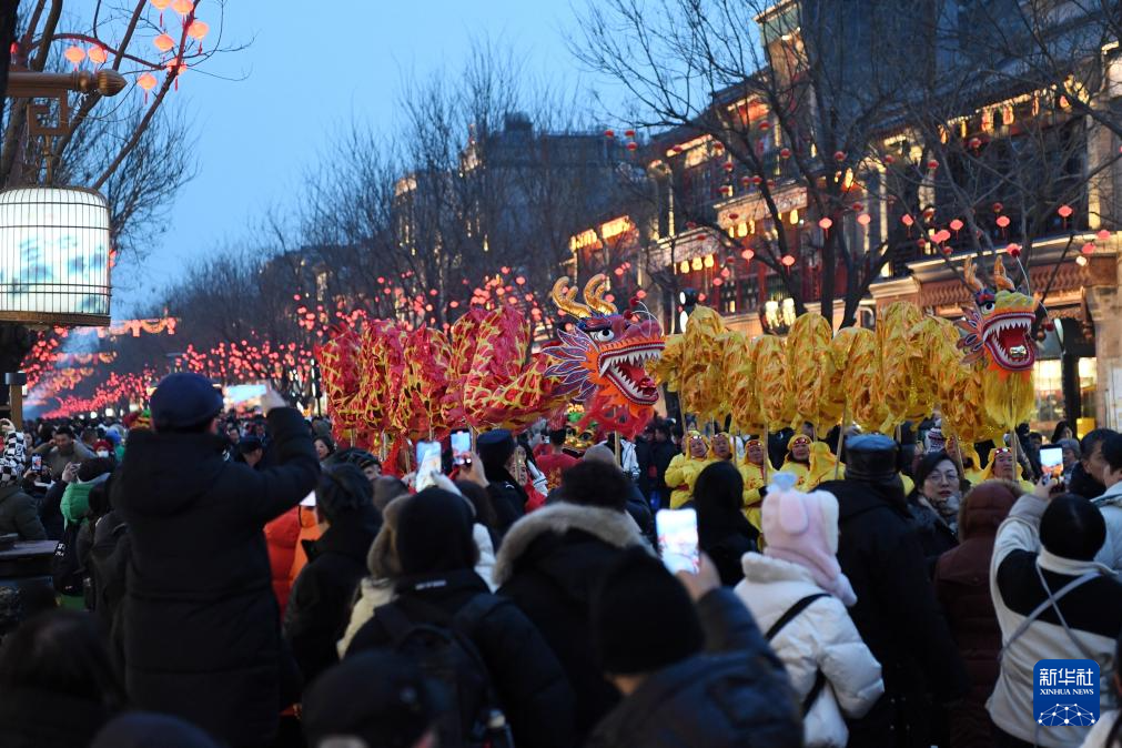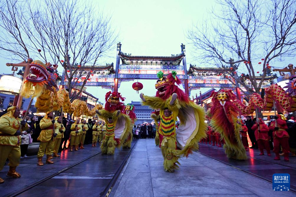 2月2日,演员在北京前门大街进行舞龙舞狮表演。 当日,“中轴纳福·龙跃前门”前门迎新春促消费活动开幕。据介绍,此次活动聚焦“老字号+国潮”文化,通过“春晚龙行北京”“龙腾盛世·中轴纳福”及舞龙舞狮等系列主题活动,为广大市民和消费者打造“文化+”“科技+”新体验,迎接龙年新春,让消费者在前门的古韵今风中感受京城浓浓的年味。 新华社记者 鞠焕宗 摄