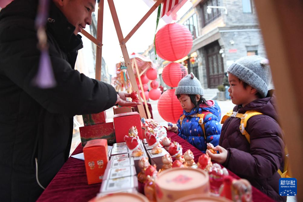 2月2日,小朋友在北京前门大街的国潮市集参观。 当日,“中轴纳福·龙跃前门”前门迎新春促消费活动开幕。据介绍,此次活动聚焦“老字号+国潮”文化,通过“春晚龙行北京”“龙腾盛世·中轴纳福”及舞龙舞狮等系列主题活动,为广大市民和消费者打造“文化+”“科技+”新体验,迎接龙年新春,让消费者在前门的古韵今风中感受京城浓浓的年味。 新华社记者 鞠焕宗 摄
