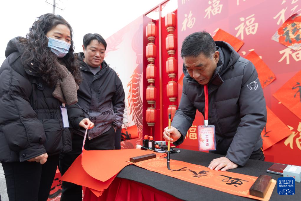 2月2日,2024严家湾村晚在上海市闵行区华漕镇赵家村严家湾举办,书法爱好者在村晚现场为群众书写春联。 随着北方、南方小年相继到来,各地春节氛围日益浓厚。 新华社记者 王翔 摄