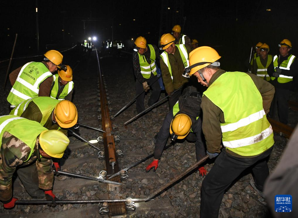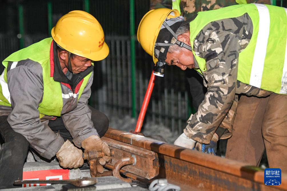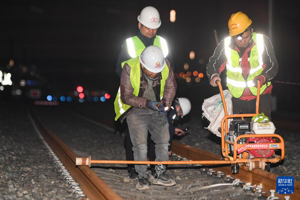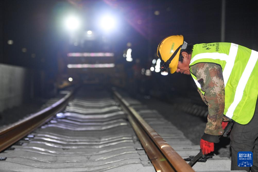 2月2日凌晨,工人在渝昆高铁渝宜段重庆西站一接轨点进行铺轨施工作业。 新华社记者 王全超 摄