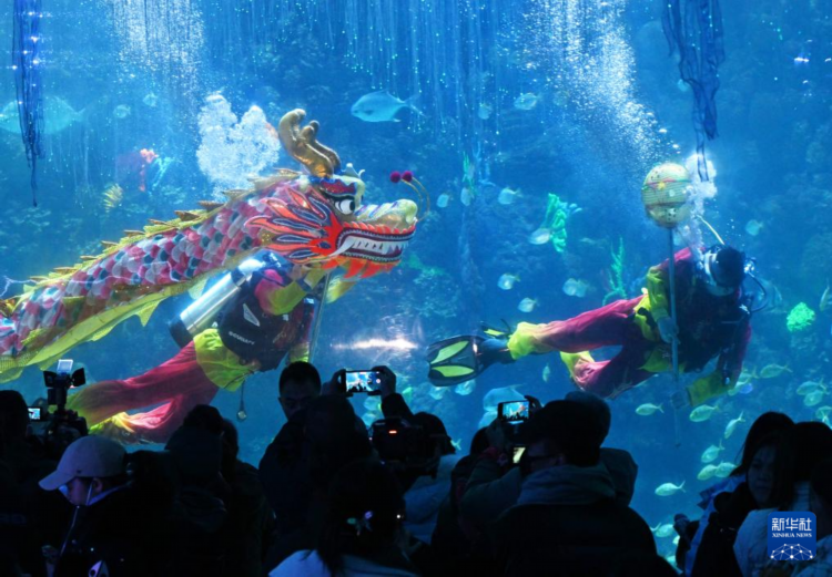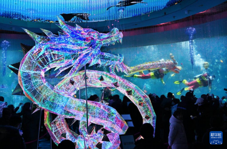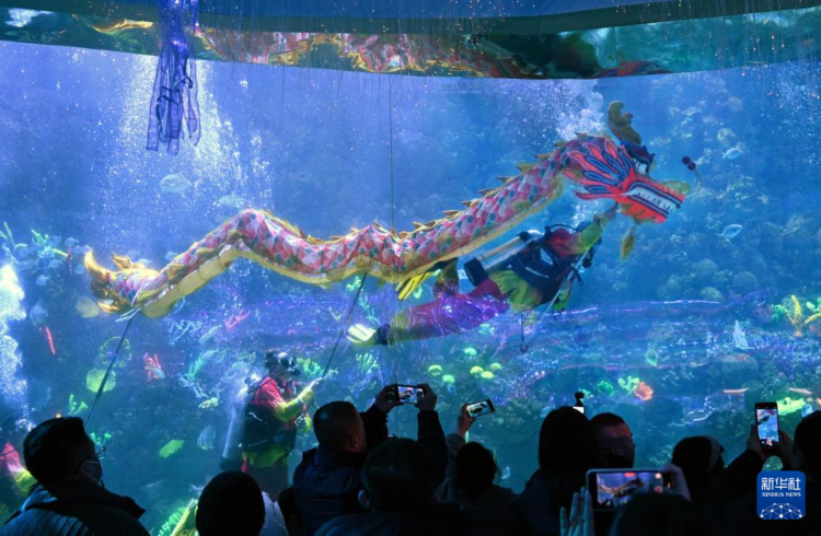2月3日,潜水员在水下进行舞龙表演。 近日,青岛极地海洋公园推出“水下舞龙贺新春”民俗表演活动,迎接即将到来的新春佳节。 新华社记者 李紫恒 摄