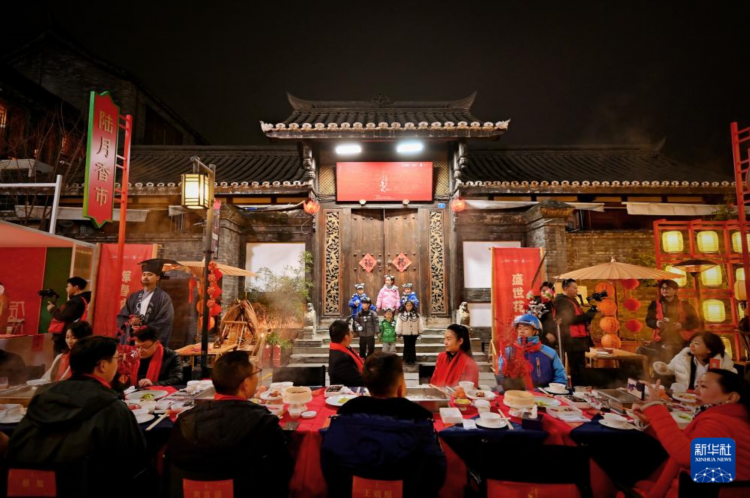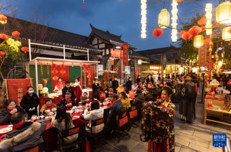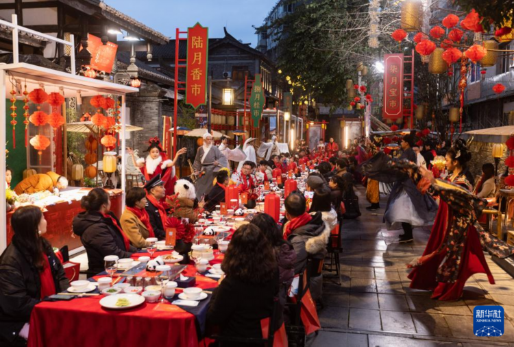 2月4日拍摄的活动现场。 当日,有成都“城市会客厅”之称的宽窄巷子举行“在成都,遇见中国年—— 十二月市年夜饭 温暖幸福年”活动,环卫工人、快递小哥、大运会志愿者、高新技术人才、国际友人等48位嘉宾欢聚12桌“家宴”,在民俗表演中享美食、迎新春。 新华社记者 江宏景 摄