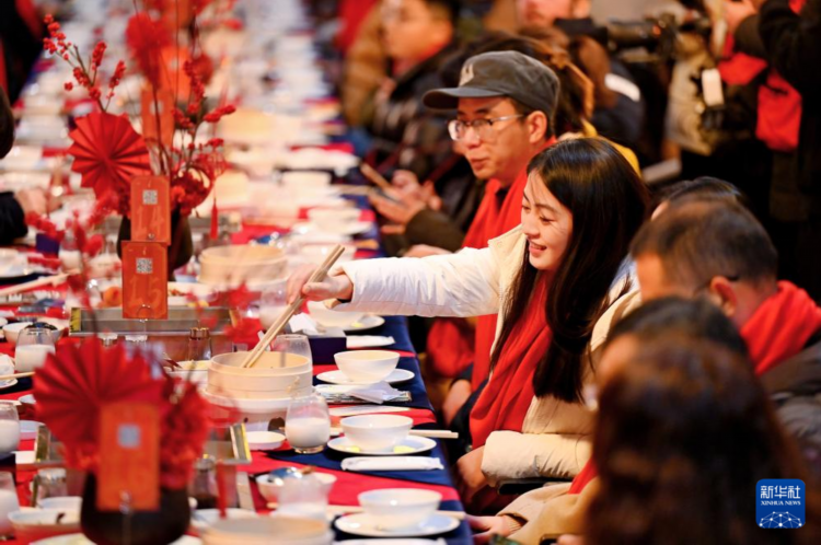 2月4日,参加活动的嘉宾们共享美食。 当日,有成都“城市会客厅”之称的宽窄巷子举行“在成都,遇见中国年—— 十二月市年夜饭 温暖幸福年”活动,环卫工人、快递小哥、大运会志愿者、高新技术人才、国际友人等48位嘉宾欢聚12桌“家宴”,在民俗表演中享美食、迎新春。 新华社记者 江宏景 摄