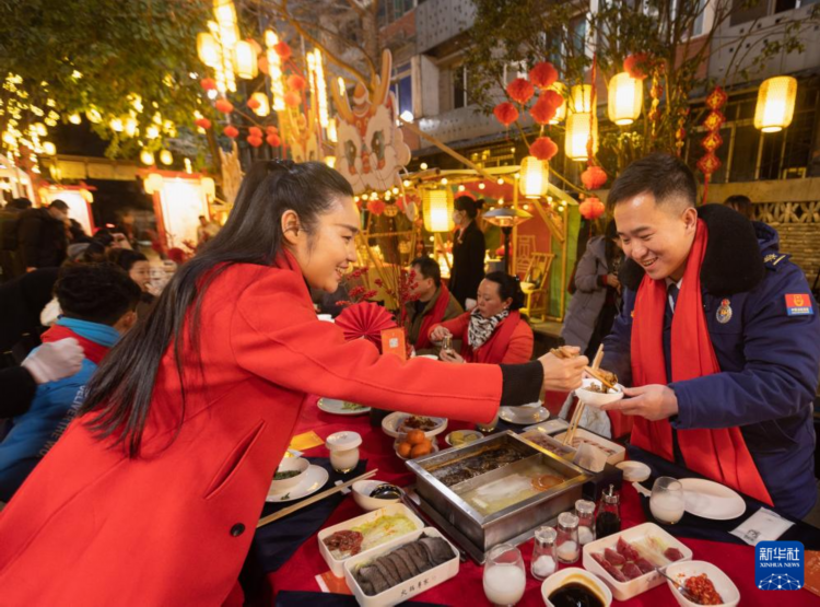 2月4日,参加活动的嘉宾廖三怡(左)给消防员王震原夹菜。 当日,有成都“城市会客厅”之称的宽窄巷子举行“在成都,遇见中国年—— 十二月市年夜饭 温暖幸福年”活动,环卫工人、快递小哥、大运会志愿者、高新技术人才、国际友人等48位嘉宾欢聚12桌“家宴”,在民俗表演中享美食、迎新春。 新华社记者 江宏景 摄