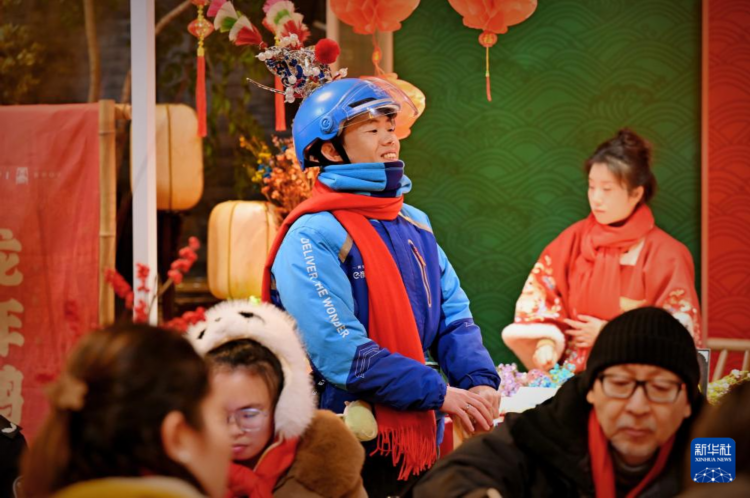 2月4日,外卖小哥赵明阳在活动中向大家致以新春问候。 当日,有成都“城市会客厅”之称的宽窄巷子举行“在成都,遇见中国年—— 十二月市年夜饭 温暖幸福年”活动,环卫工人、快递小哥、大运会志愿者、高新技术人才、国际友人等48位嘉宾欢聚12桌“家宴”,在民俗表演中享美食、迎新春。 新华社记者 江宏景 摄 |
