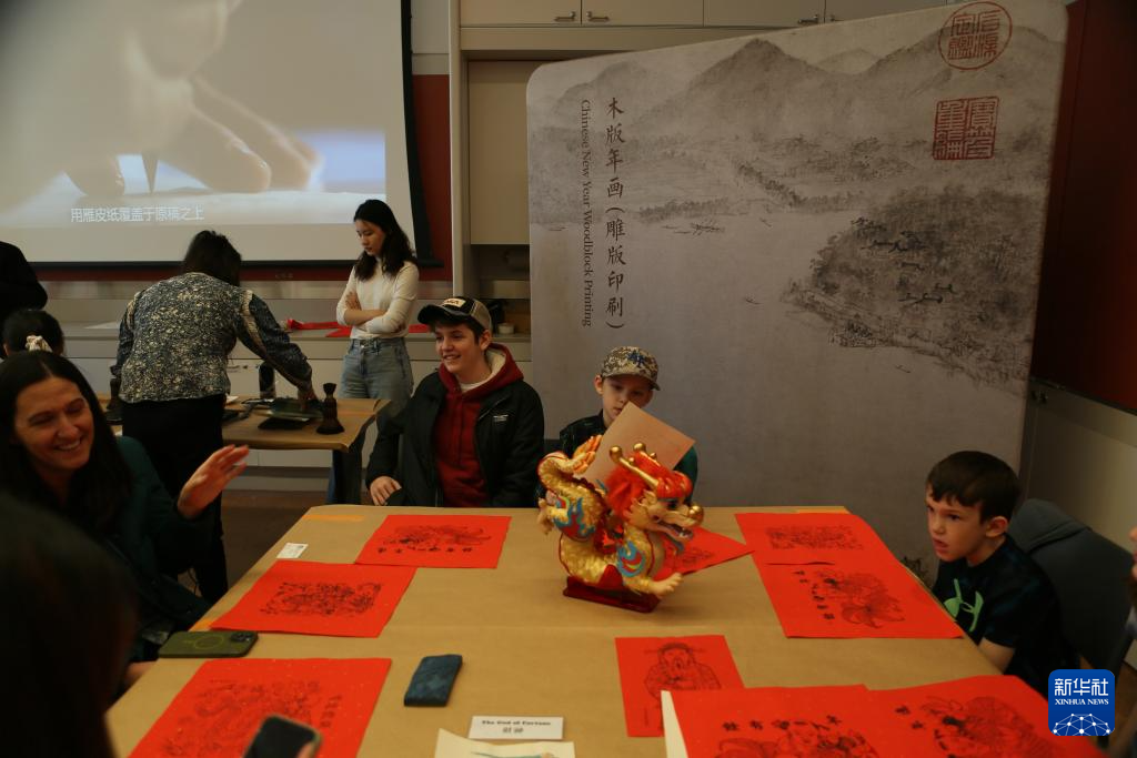 2月3日,在美国纽约大都会艺术博物馆,参观者制作木版年画。 当日,美国纽约大都会艺术博物馆2024“喜迎龙年·欢乐春节”庆祝活动举行,舞龙表演、木版年画、龙年特展等吸引大量参观者。 新华社记者 张凤国 摄