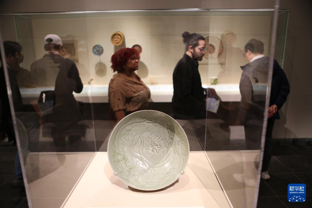 2月3日,在美国纽约大都会艺术博物馆,参观者走过“龙年吉祥”特展上展出的越窑青瓷龙纹碗。 当日,美国纽约大都会艺术博物馆2024“喜迎龙年·欢乐春节”庆祝活动举行,舞龙表演、木版年画、龙年特展等吸引大量参观者。 新华社记者 张凤国 摄