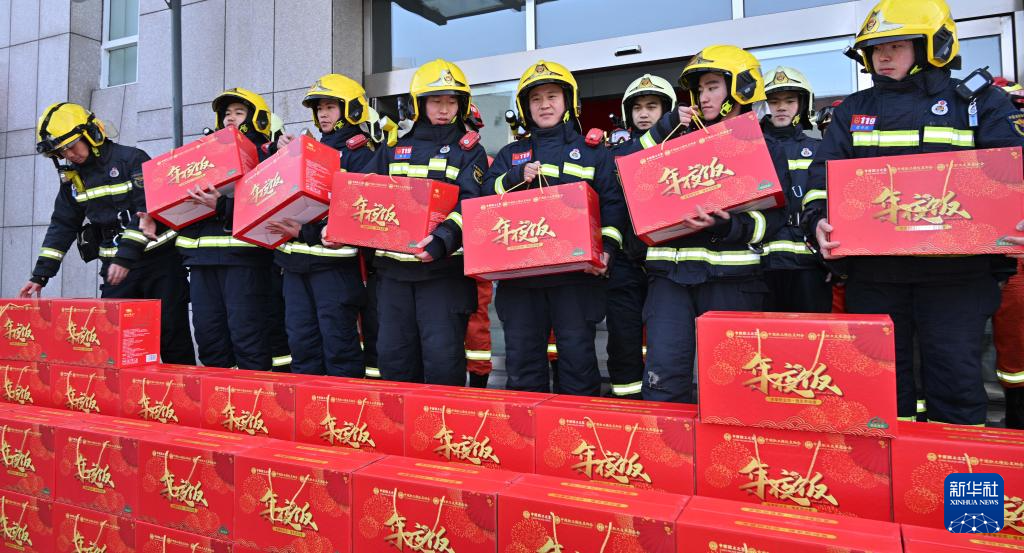 2月6日,北京市大兴区消防救援支队的指战员领取慰问品。 在春节来临之际,中国职工发展基金会联合中国职工之家、中国职工保险互助会开展“关爱新业态、情系劳动者”春节慰问活动,向坚守岗位的职工赠送年夜饭礼包,并向职工及其家人致以新春祝福。 新华社记者 陈晔华 摄pagebreak