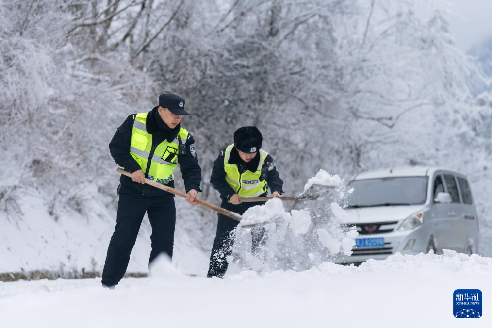 2月6日,民警在宜昌兴山县高桥乡209国道烟灯垭路段清理积雪。 连日来,罕见的雨雪冰冻天气席卷湖北省全境,湖北各地加强路面巡逻、救助受困群众和车辆,在受冰冻灾害部位开展除冰融雪、警车带道压速等工作,消除交通安全隐患,护航群众回家路。 新华社发(王鹏程摄)pagebreak