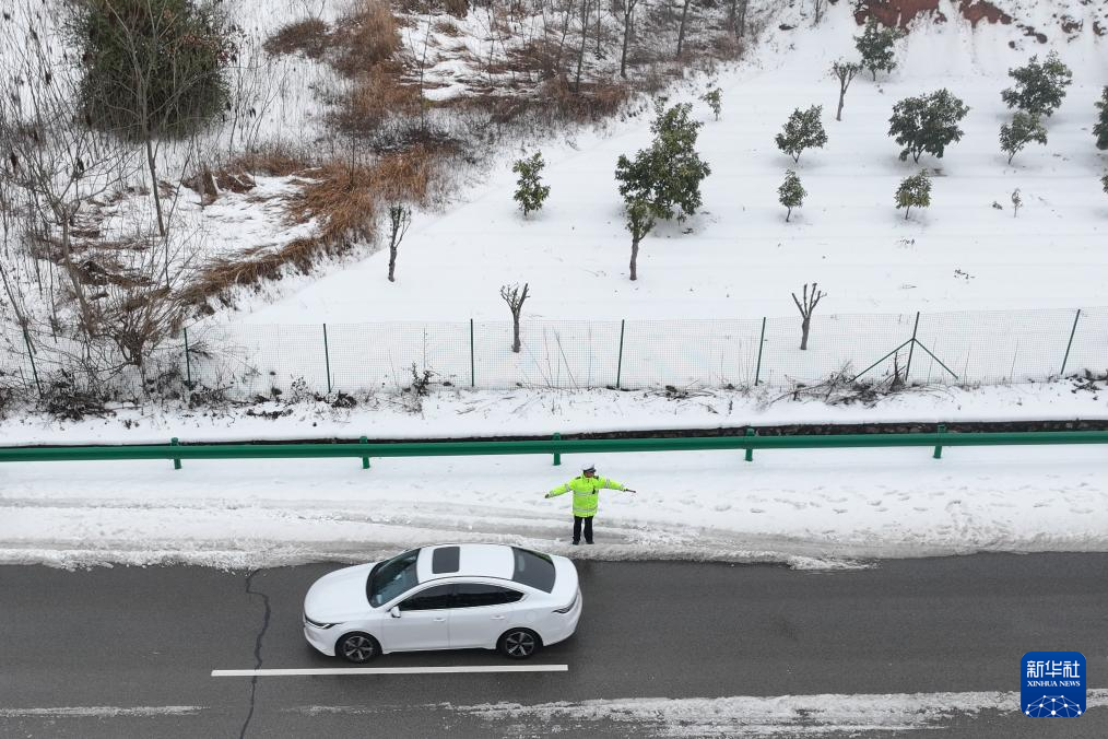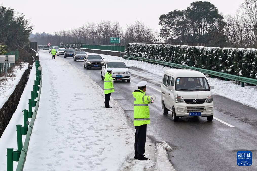 2月6日,宜昌公安交警在岳宜高速上疏导车辆通过积雪路段。 连日来,罕见的雨雪冰冻天气席卷湖北省全境,湖北各地加强路面巡逻、救助受困群众和车辆,在受冰冻灾害部位开展除冰融雪、警车带道压速等工作,消除交通安全隐患,护航群众回家路。 新华社记者肖艺九摄pagebreak