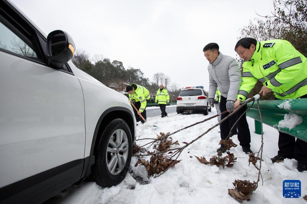 2月6日,宜昌公安交警在岳宜高速上帮助被困车辆脱困。 连日来,罕见的雨雪冰冻天气席卷湖北省全境,湖北各地加强路面巡逻、救助受困群众和车辆,在受冰冻灾害部位开展除冰融雪、警车带道压速等工作,消除交通安全隐患,护航群众回家路。 新华社记者肖艺九摄pagebreak