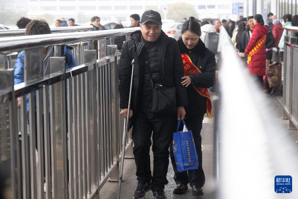 2月6日,宜昌东火车站工作人员帮助旅客进站乘车。 连日来,罕见的雨雪冰冻天气席卷湖北省全境,湖北各地加强路面巡逻、救助受困群众和车辆,在受冰冻灾害部位开展除冰融雪、警车带道压速等工作,消除交通安全隐患,护航群众回家路。 新华社记者肖艺九摄pagebreak