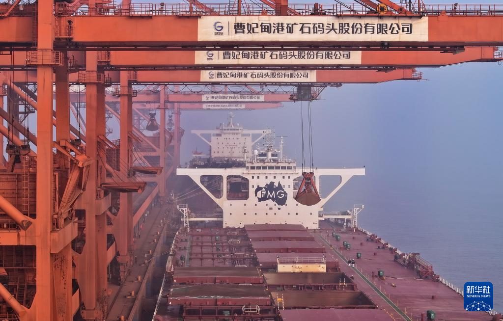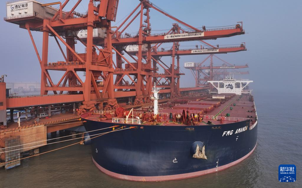 2月7日,一艘轮船靠泊在唐山港曹妃甸港区矿石码头卸载(无人机照片)。 记者从河北省唐山市海洋口岸和港航管理局获悉,今年1月份唐山港完成货物吞吐量7321万吨,同比增长13.40%。其中外贸吞吐量3290万吨,同比增长22.12%。 新华社记者杨世尧摄pagebreak