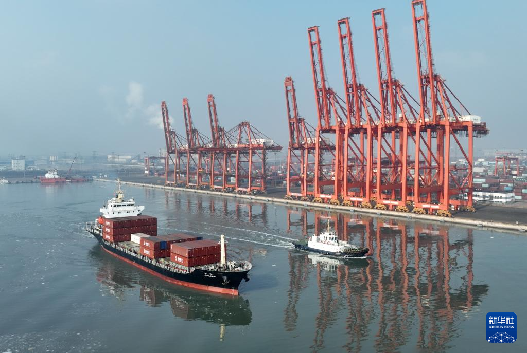 2月7日,一艘轮船在唐山港京唐港区集装箱码头装完货物后离港(无人机照片)。 记者从河北省唐山市海洋口岸和港航管理局获悉,今年1月份唐山港完成货物吞吐量7321万吨,同比增长13.40%。其中外贸吞吐量3290万吨,同比增长22.12%。 新华社记者杨世尧摄pagebreak