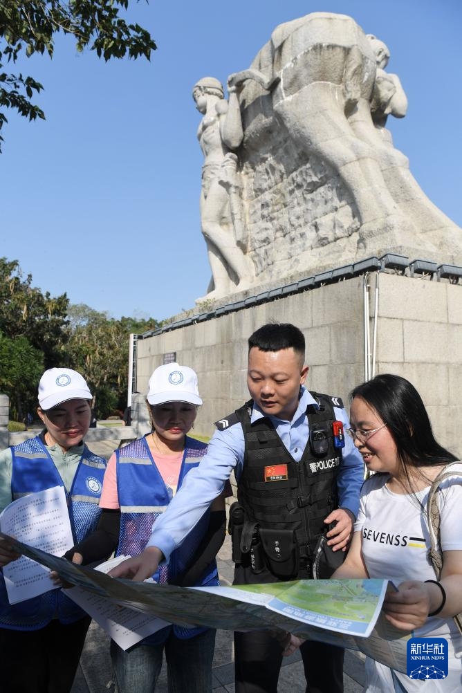 2月7日,在三亚市鹿回头风景区,鹿回头派出所民辅警(右二)和“鹿回头义警”志愿者为游客(右一)做旅游咨询服务。 近期,三亚进入旅游旺季,国家4A级旅游景区鹿回头风景区客流量激增。三亚鹿回头派出所积极向社会招募义警志愿者,携手维护治安,助力旅游建设。 新华社记者 赵颖全 摄pagebreak