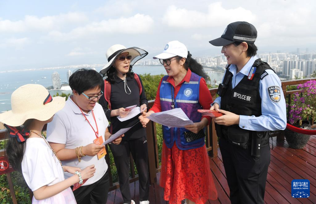 2月7日,在三亚市鹿回头风景区,鹿回头派出所民警(右一)和“鹿回头义警”志愿者(右二)向游客普及反诈知识。 近期,三亚进入旅游旺季,国家4A级旅游景区鹿回头风景区客流量激增。三亚鹿回头派出所积极向社会招募义警志愿者,携手维护治安,助力旅游建设。 新华社记者 赵颖全 摄 |