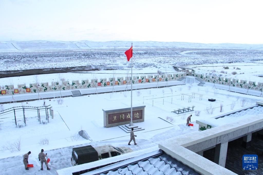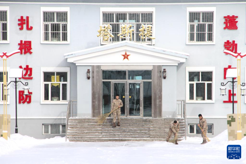 1月12日,边防战士在小白杨哨所清扫积雪。