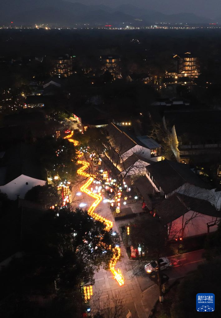 西溪湿地亮起的龙形灯(无人机照片,2月8日摄)。