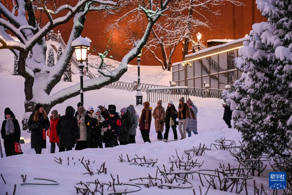 2月7日,游客走在俄罗斯首都莫斯科克里姆林宫附近的雪地里。 当日,俄罗斯首都莫斯科迎来降雪。 新华社记者 曹阳 摄