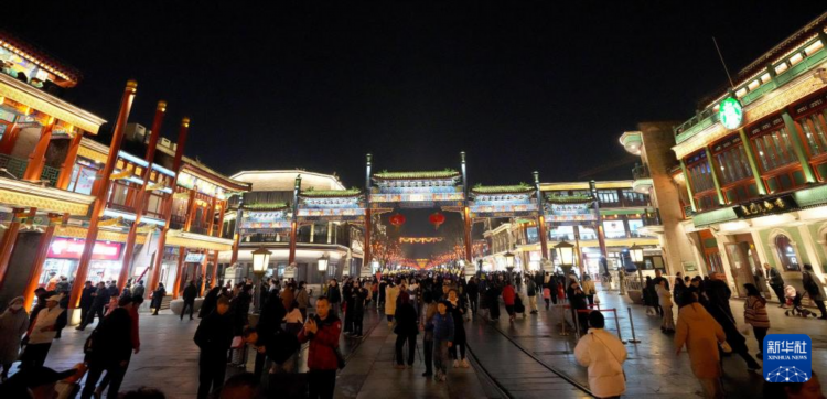 2月17日晚,人们在北京前门大街游览赏景。 当日是农历正月初八,北京前门大街入夜后灯火璀璨,吸引市民游客来这里逛街、赏灯,感受浓浓年味。 新华社记者 王毓国 摄