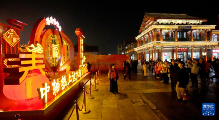 2月17日晚,人们在北京前门大街春节景观前拍照。 当日是农历正月初八,北京前门大街入夜后灯火璀璨,吸引市民游客来这里逛街、赏灯,感受浓浓年味。 新华社记者 王毓国 摄