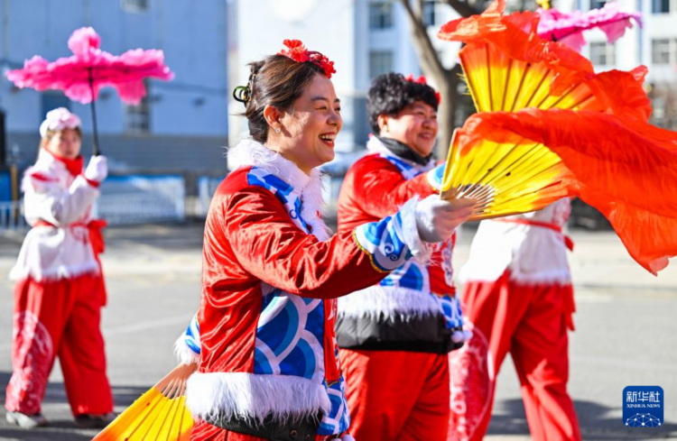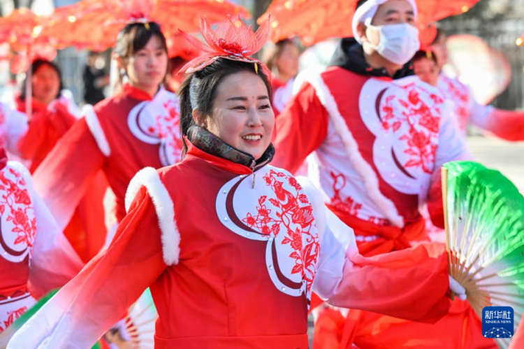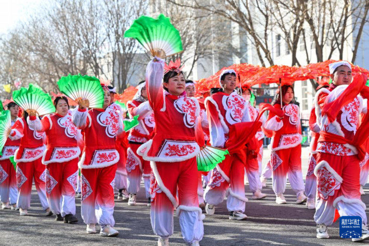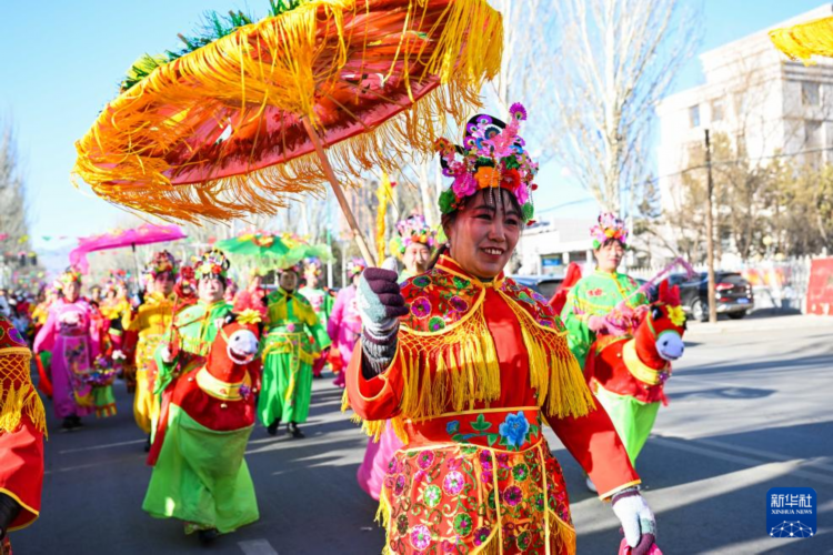2月17日,表演者在凉城县街道上巡游演出。 当日是正月初八,内蒙古乌兰察布市凉城县举办二人台、扭秧歌等丰富多彩的民俗演出活动,吸引了不少市民前来观看。据了解,从正月初八到元宵节,凉城县多支文艺团队每天都会在街道、广场进行演出,丰富市民文化生活。 新华社记者 刘磊 摄