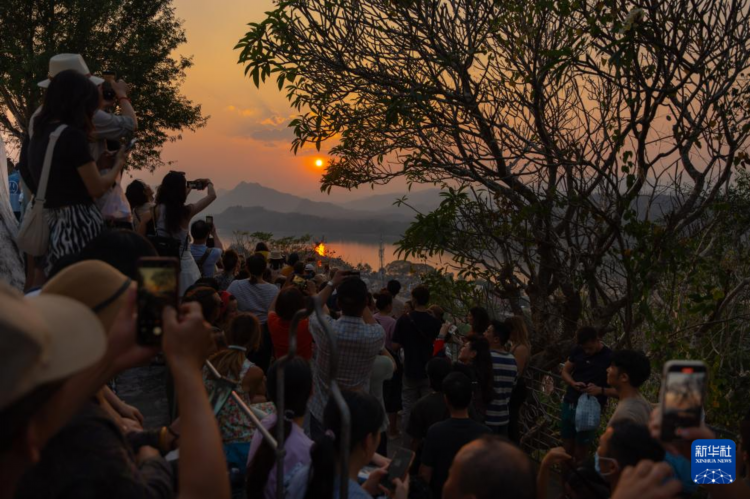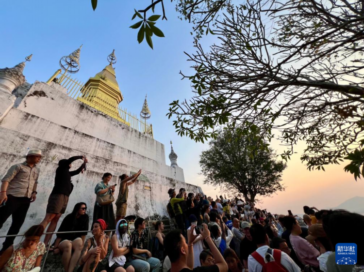 2月16日,游客在老挝琅勃拉邦普西山山顶观赏落日景观。 2024年,中老铁路国际旅客列车迎来自2023年4月13日开通后的首个春运。不少游客选择春节假期乘坐中老铁路国际旅客列车跨境旅行,让老挝沿线旅游业进一步发展升温。 新华社发(凯乔摄)