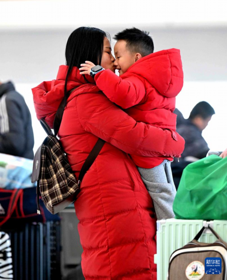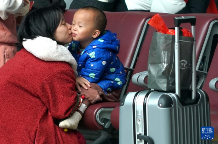 2月17日,在石家庄火车站候车大厅,一位母亲在亲吻自己的孩子。 新华社发(陈其保 摄)