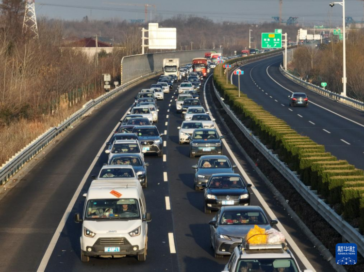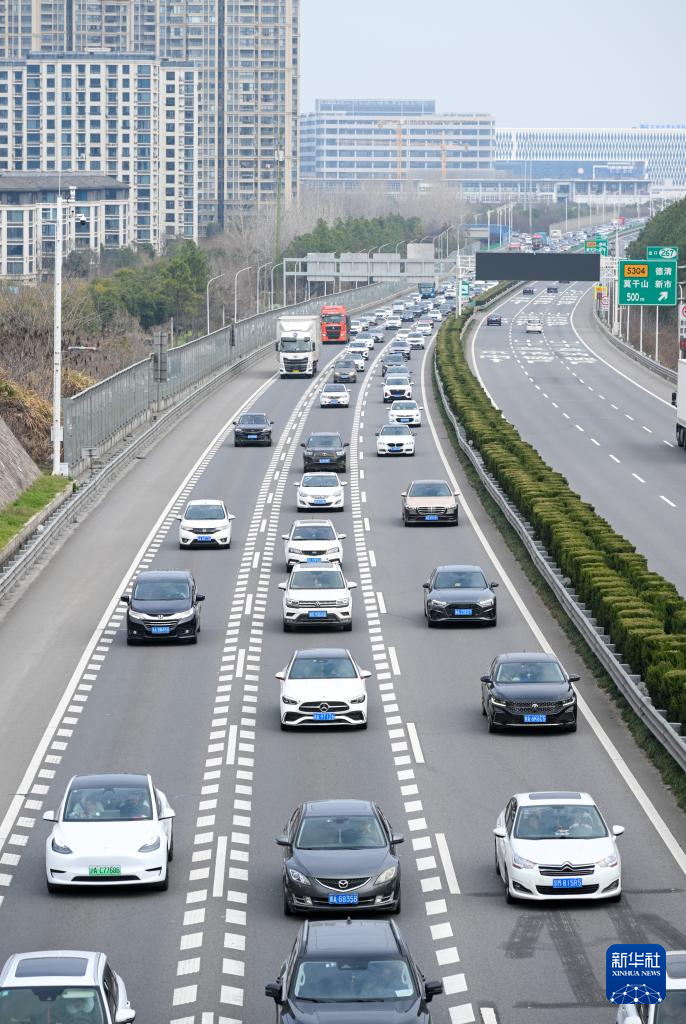 2月17日,浙江省湖州市杭宁高速德清段杭州方向,车辆在高速公路上缓慢行驶。 新华社发 (蔡俊 摄)