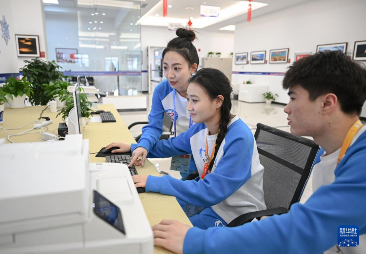 2月19日,志愿者们在媒体服务台工作。 2月17日,第十四届全国冬季运动会在内蒙古自治区呼伦贝尔市开幕。在“十四冬”赛场内外,有一群默默奉献的志愿者,他们被大家亲切地称为“小雪团”。各赛区志愿者在接待保障、礼仪、竞赛服务、安全保障、兴奋剂检测、场地器材服务等岗位提供志愿服务,为运动员、观众、媒体、工作人员送去温暖。 据了解,此次“十四冬”志愿者总规模超2000人,他们主要来自各赛区高校,其中按照京蒙共青团协作机制,由北京团市委选派了30名北京冬奥会志愿者支援“十四冬”。 新华社记者 连振 摄