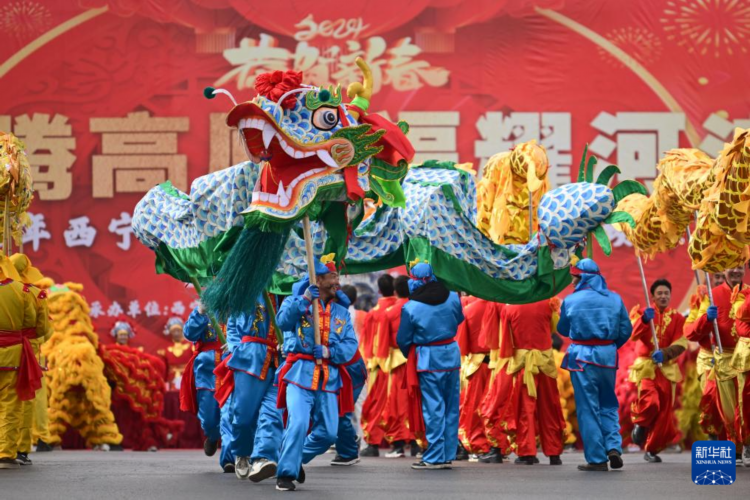 2月19日,在青海省西宁市,舞龙队员在社火巡游活动中表演。 当日是农历正月初十,青海省西宁市举办优秀社火集中巡游活动,超过2000名演员参加巡游表演,为市民群众带来一场节日文化盛宴。 新华社记者 张龙 摄
