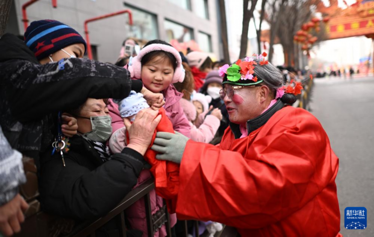 2月19日,在青海省西宁市,一名社火队演员(右)与市民群众互动。 当日是农历正月初十,青海省西宁市举办优秀社火集中巡游活动,超过2000名演员参加巡游表演,为市民群众带来一场节日文化盛宴。 新华社记者 张宏祥 摄