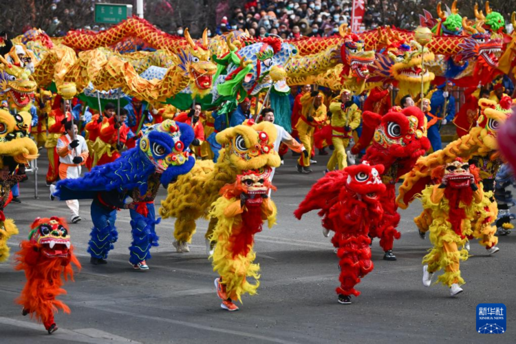 2月19日,在青海省西宁市,舞狮队员在社火巡游活动中表演。 当日是农历正月初十,青海省西宁市举办优秀社火集中巡游活动,超过2000名演员参加巡游表演,为市民群众带来一场节日文化盛宴。 新华社记者 张龙 摄