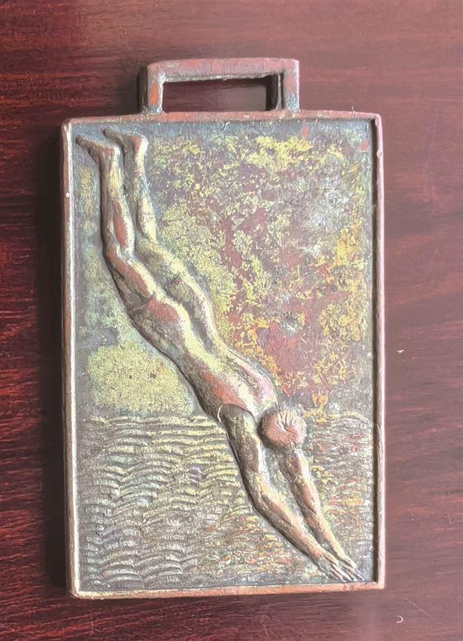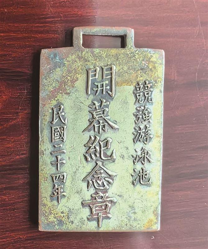 一枚89年前的纪念章,见证了厦门曾经轰动全国的体坛盛事。这枚1935年“竞强游泳池开幕纪念章”,是前不久鼓浪屿上一处百年老别墅的业主在进行内部整理修缮时,与一批旧家具、纸张和杂件一起流入厦门收藏品市场的。纪念章长10厘米、宽5厘米、厚3毫米,为紫铜鎏金材质,正面铸有“竞强游泳池开幕纪念章,民国二十四年”阳文字样,背面是一名运动员跃入泳池的浮雕图案。
