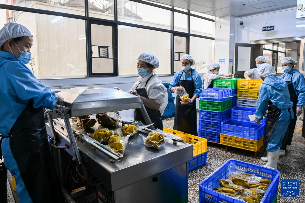 2月20日,在兴业县一家企业,工人分装生产好的预制菜。 春节假期过后,广西兴业县不少企业抓紧时间开工抢订单、忙生产。统计数据显示,截至2月20日,兴业县规上企业开工率达100%,限上企业开工率达94%。 新华社记者 曹祎铭 摄