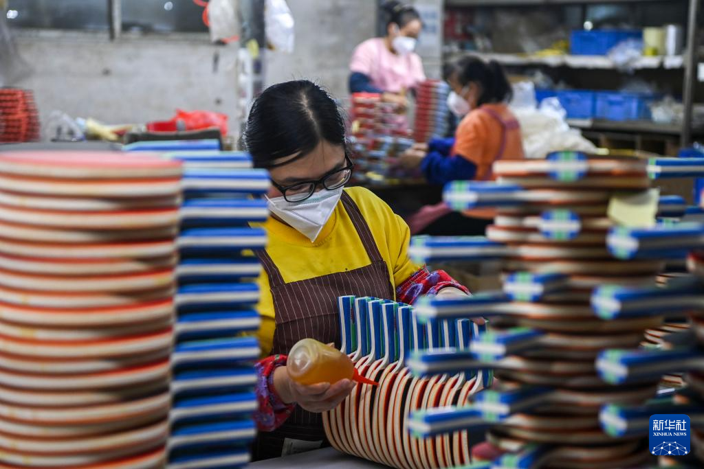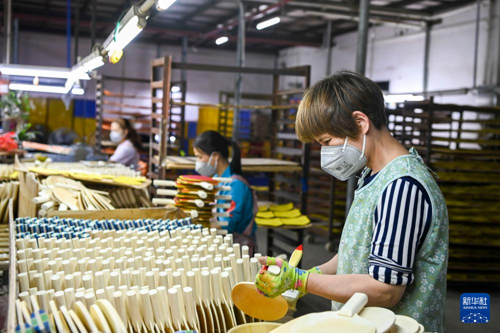 2月20日,在兴业县一家出口型企业,工人生产乒乓球拍。 春节假期过后,广西兴业县不少企业抓紧时间开工抢订单、忙生产。统计数据显示,截至2月20日,兴业县规上企业开工率达100%,限上企业开工率达94%。 新华社记者 曹祎铭 摄