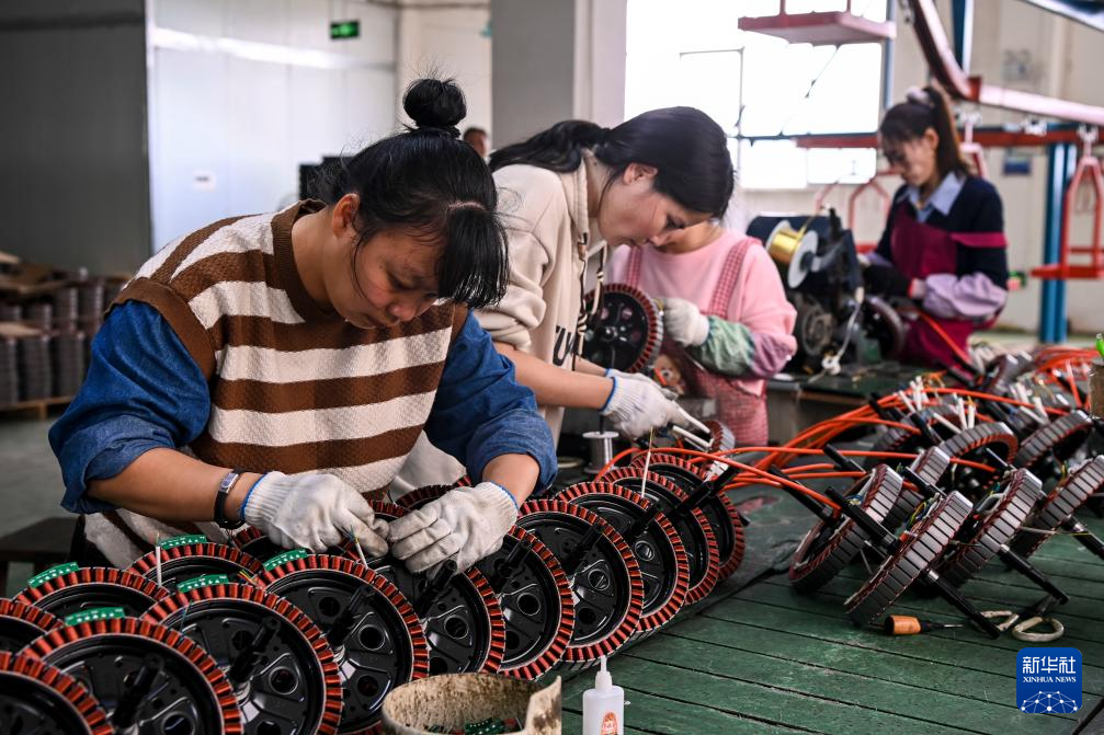 2月20日,在兴业县一家企业,工人装配车用电机。 春节假期过后,广西兴业县不少企业抓紧时间开工抢订单、忙生产。统计数据显示,截至2月20日,兴业县规上企业开工率达100%,限上企业开工率达94%。 新华社记者 曹祎铭 摄