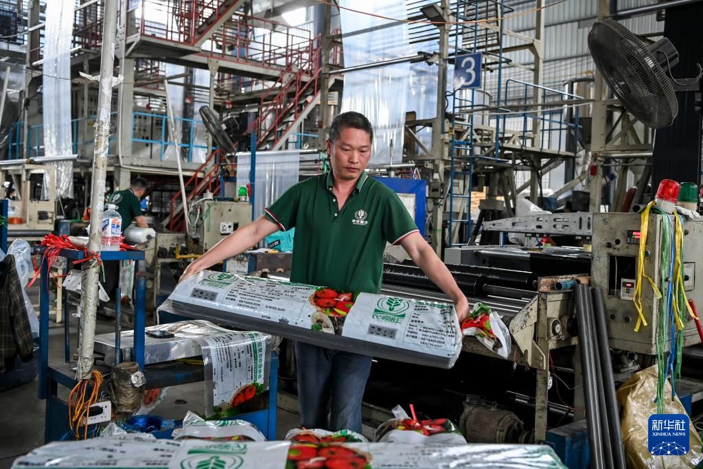 2月20日,在兴业县一家企业,工人搬运刚生产好的农用塑膜。 春节假期过后,广西兴业县不少企业抓紧时间开工抢订单、忙生产。统计数据显示,截至2月20日,兴业县规上企业开工率达100%,限上企业开工率达94%。 新华社记者 曹祎铭 摄