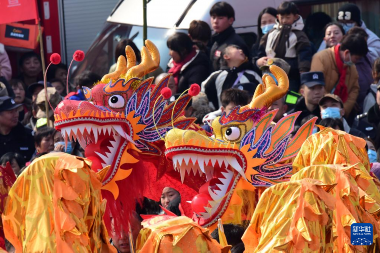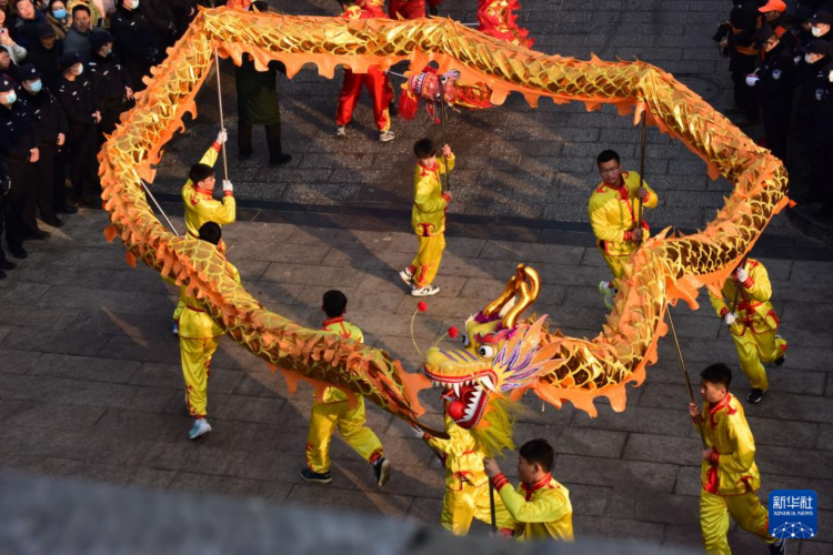 2月25日,浚县民间社火团体在古庙会上表演舞龙。 农历正月十六,在河南省浚县举行的正月传统古庙会上,数十支由当地群众组成的社火表演团队轮番表演抬阁、舞狮、踩高跷等社火演出。据介绍,河南浚县正月古庙会已有1600多年历史,被誉为民俗文化的“活化石”。 新华社记者 朱祥 摄