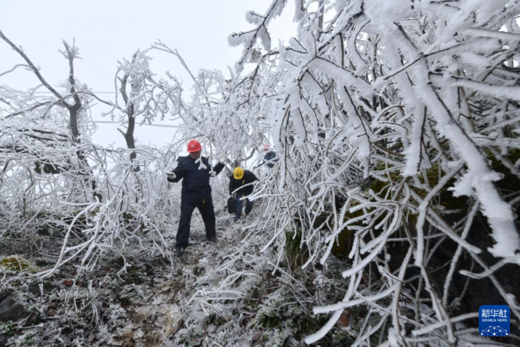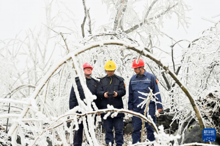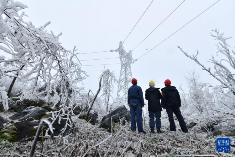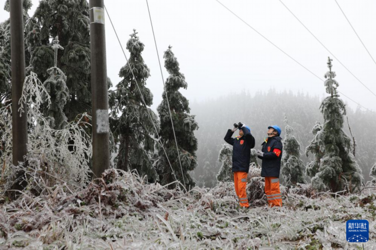 2月26日,在桂林市全州县绍水镇,抢修队员在观察线路覆冰情况。 连日来,受冷空气影响,广西桂北高寒山区出现低温雨雪冰冻天气,导致电力线路覆冰,南方电网广西电网公司启动低温雨雪冰冻灾害Ⅲ级应急响应,及时组织电力抢修队伍,开展防冰抗冰应急处置工作,保障电网安全稳定运行和电力可靠供应。 新华社发(俞超 摄)