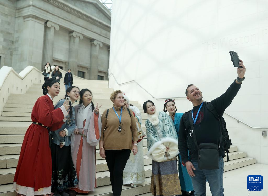 2月25日,在英国伦敦大英博物馆,参观者与汉服爱好者合影留念。